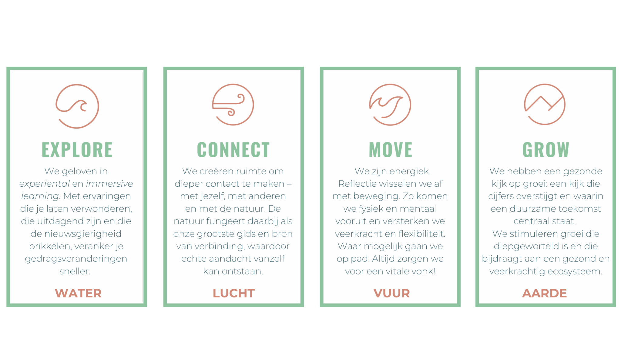 Explore, Connect, Move & Grow komen terug in het ontwerp en de uitvoering van de programma’s en vormen ook de basis van de Survital-methodiek, die is geïnspireerd op de kracht van de vier elementen: water, lucht, vuur en aarde.